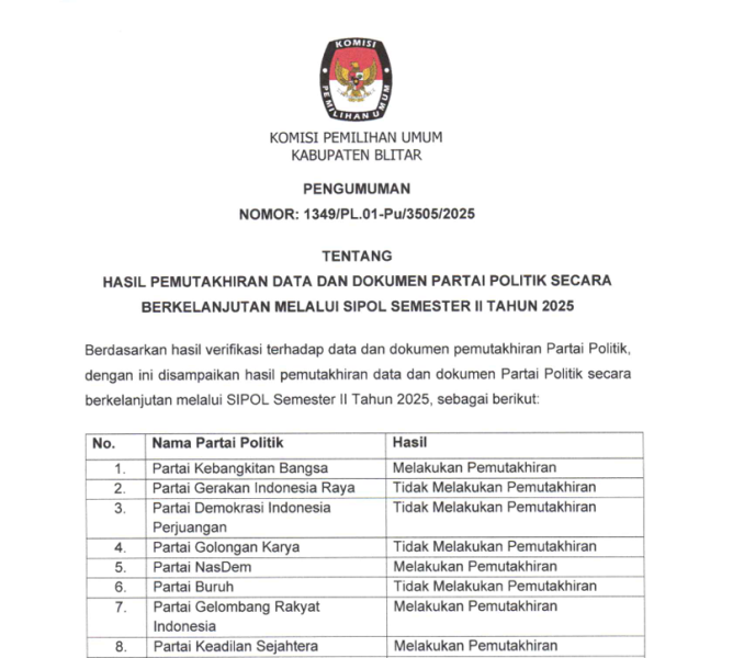 Berdasarkan Pengumuman nomor 1349/PL.01-Pu/3505/2025, KPU Kabupaten Blitar mengumumkan hasil pemutakhiran data dan dokumen partai politik secara berkelanjutan melalui SIPOL Semester II Tahun 2025. Info selengkapnya : PENGUMUMAN HASIL PEMUTAKHIRAN DATA DAN DOKUMEN PARTAI POLITIK SECARA BERKELANJUTAN MELALUI SIPOL SEMESTER II TAHUN 2025 (klik disini) ....