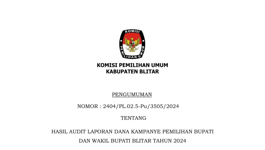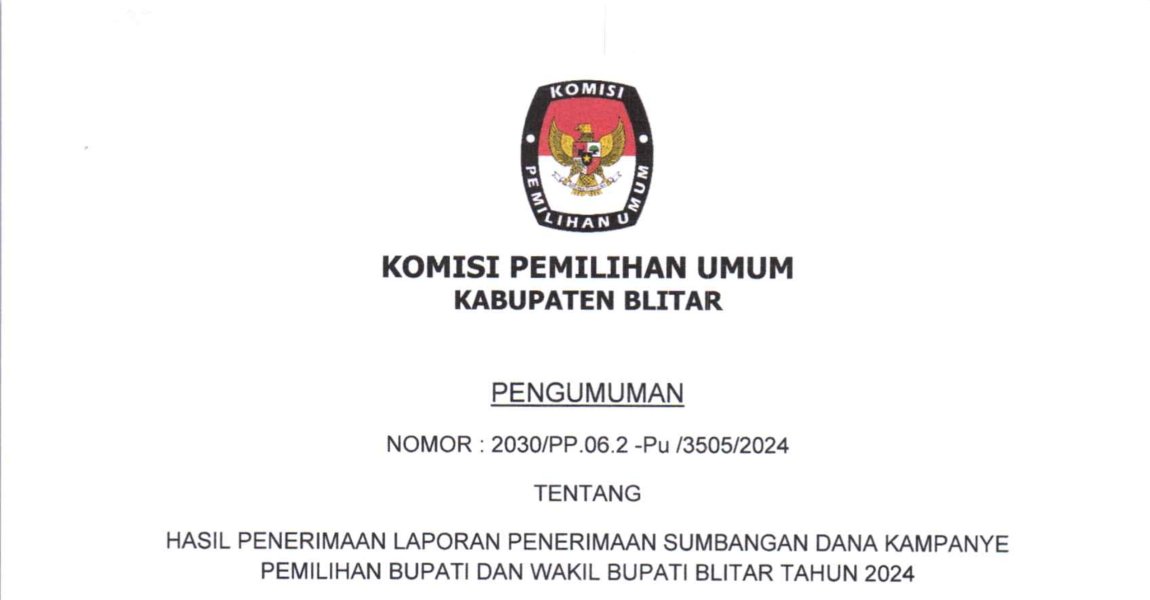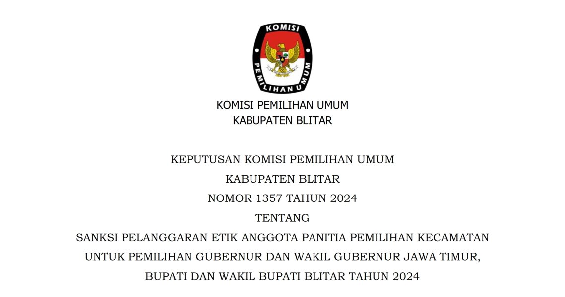 Blitar, kab-blitar.kpu.go.id - Melalui Surat Keputusan Komisi Pemilihan Umum Kabupaten Blitar Nomor 1357 Tahun 2024, Komisi Pemilihan Umum Kabupaten Blitar mengumumkan perihal Sanksi Pelanggaran Etik Anggota Panitia Pemilihan Kecamatan Untuk Pemilihan Gubernur Dan Wakil Gubernur Jawa Timur, Bupati Dan Wakil Bupati Blitar Tahun 2024 sebagai berikut. Selengkapnya :