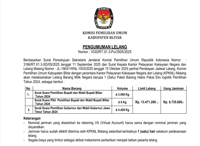 Berdasarkan Pengumuman Lelang Nomor 1030/RT.01.3-Pu/3505/2025, KPU Kabupaten Blitar mengumumkan Lelang Non Eksekusi Wajib Barang Milik Negara berupa Barang Habis Pakai (Surat Suara Pemilihan Bupati dan Wakil Bupati Blitar, Surat Suara PSU Pemilihan Bupati dan Wakil Bupati Blitar, dan Suarat Suara Pemilihan Gubernur dan Wakil Gubernur Jawa Timur) Eks Pilkada 2024 . Info selengkapnya :