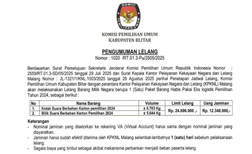 Berdasarkan Pengumuman Lelang Nomor 1020/RT.01.3-Pu/3505/2025, KPU Kabupaten Blitar mengumumkan Lelang Non Eksekusi Wajib Barang Milik Negara berupa Barang habis Pakai (Kotak Suara dan Bilik Suara) Eks Pilkada 2024 . Info selengkapnya :