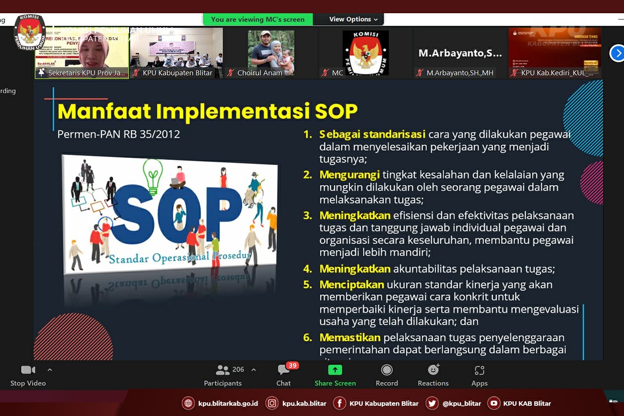 Blitar, kab-blitar.kpu.go.id - KPU Kabupaten Blitar mengikuti kegiatan Bimbingan Teknis Penyusunan Standar Operasional Prosedur (SOP) yang diselenggarakan oleh KPU Provinsi Jawa Timur, Kamis (14/4). Kegiatan Bimtek tersebut diikuti oleh KPU Kabupaten / Kota se Jawa Timur. Dari KPU Kabupaten Blitar dihadiri oleh Ketua KPU, Hadi Santosa, beserta seluruh anggota, serta ASN di lingkungan sekretariat KPU Kabupaten Blitar.