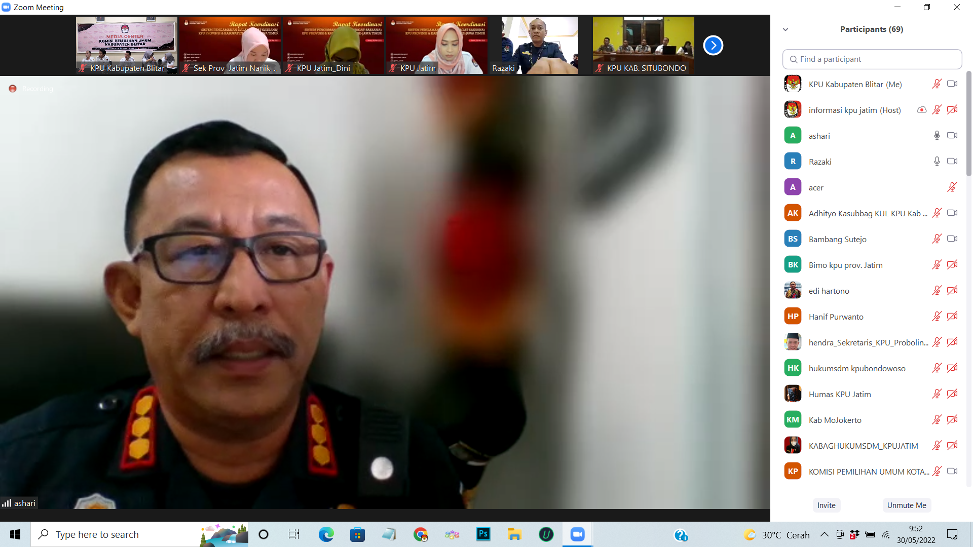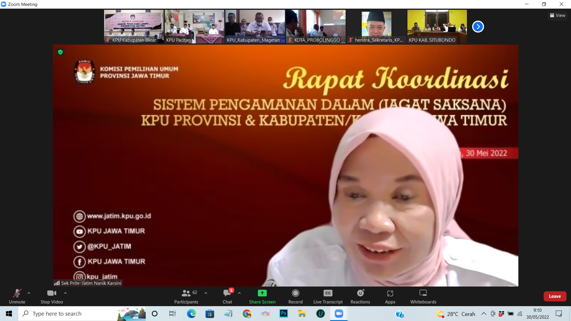 Blitar, kab-blitar.kpu.go.id – KPU Kabupaten Blitar mengikuti kegiatan rapat konsolidasi Pengamanan Dalam (PAMDAL) Tahun 2022 Senin (30/5) secara virtual. Kegiatan rapat konsolidasi tersebut diselenggarakan oleh KPU Provinsi Jawa Timur serta diikuti oleh KPU Kabupaten/ Kota se-Jawa Timur. Adapun peserta yang hadir dalam kegiatan tersebut yaitu Sekretaris, Puspita Palupi, Kasubbag Keuangan, Umum dan Logistik Dian Indriani, serta seluruh Satuan Pengamanan KPU Kabupaten Blitar. Kegiatan rapat konsolidasi ini diselenggarakan berdasarkan surat Sekretaris KPU Provinsi Jawa Timur Nomor 1260/RT.09/35/2022.
