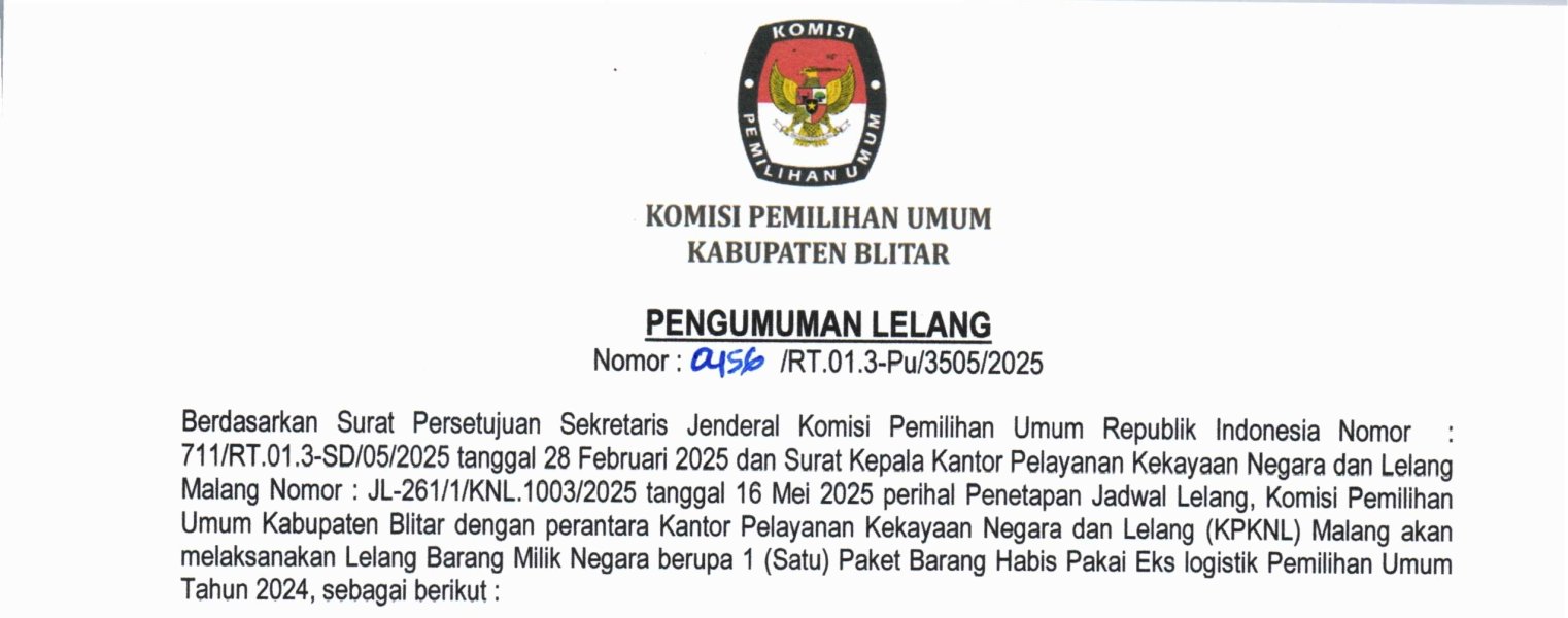Berdasarkan Pengumuman Lelang Nomor 0456/RT.01.3-Pu/3505/2025, KPU Kabupaten Blitar mengumumkan Lelang Paket Barang Habis Pakai Eks Logistik Pemilihan Umum Tahun 2024. Info selengkapnya :