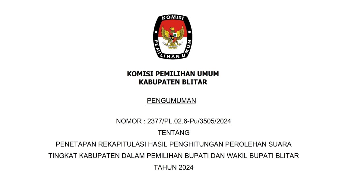 PENGUMUMAN PENETAPAN REKAPITULASI PILBUP BLITAR 2024 TINGKAT KABUPATEN BLITAR (Klik Disini)