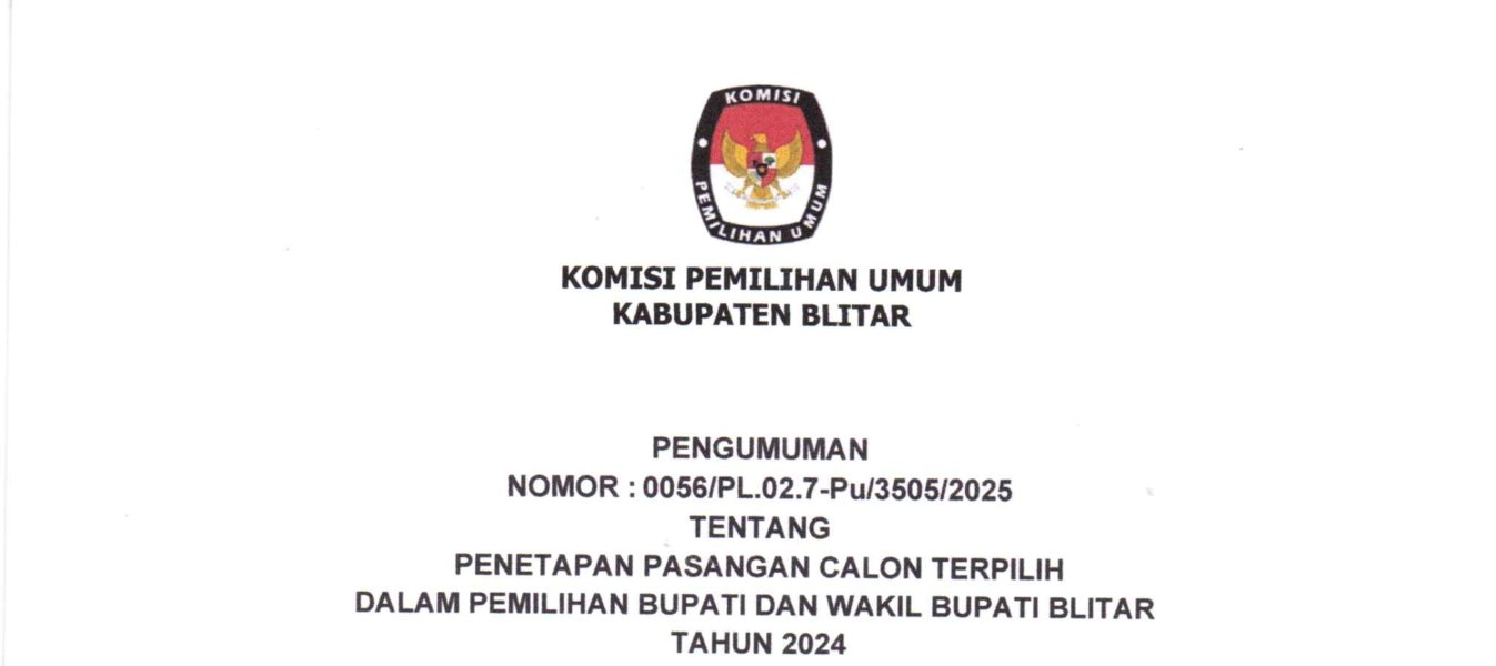 PENGUMUMAN PENETAPAN PASLON TERPILIH PILBUP BLITAR 2024
