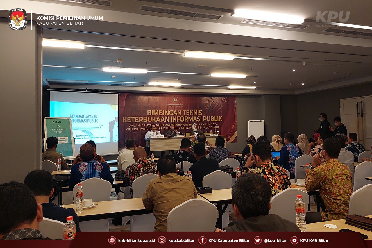 Gresik, kab-blitar.kpu.go.id – KPU Kabupaten Blitar melalui Divisi Sosdiklih Parmas menghadiri kegiatan Bimbingan Teknis Keterbukaan Informasi Publik dalam penyelenggaraan tahapan pemilu Tahun 2024 yang diselenggarakan oleh KPU Provinsi Jawa Timur. Kegiatan bimtek berlangsung mulai Kamis (22/9) hingga Jumat (23/9) bertempat di Ruang Mandala Bhakti Praja Lantai 4, Kantor Bupati Gresik Jalan DR. Wahidin Sudirohusodo, Kecamatan Kebomas, Kabupaten Gresik. Turut hadir dari KPU Kabupaten Blitar Divisi Sosdiklih Parmas dan SDM, M. Bahaudin, Kasubbag Tekmas, Unik M. dan Operator e-PPID, M. Hudin.