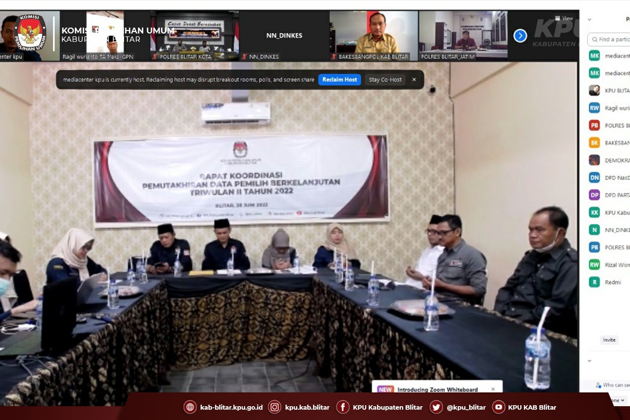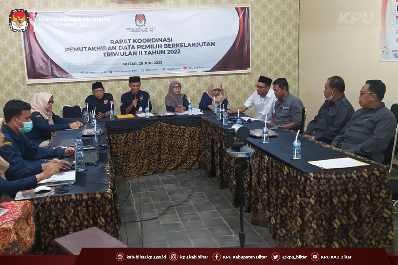 Blitar, kab-blitar.kpu.go.id - Kegiatan rapat koordinasi pemutakhiran data pemilih berkelanjutan (PDPB) Triwulan II Tahun 2022 diselenggarakan di Media Center KPU Kabupaten Blitar, Selasa (28/6). Dalam kegiatan rakor tersebut dihadiri oleh anggota KPU Kabupaten Blitar, sekretaris serta kasubbag rendatin KPU Kabupaten Blitar. Selain itu juga dihadiri oleh Bawaslu Kabupaten Blitar dan Perwakilan Purna TNI dan Polri secara luring, serta dari Polres Blitar dan Polres Blitar Kota, Kesbangpol Kab. Blitar, Dinas Kesehatan Kabupaten Blitar, dan perwakilan partai politik tingkat Kabupaten Blitar secara daring.
