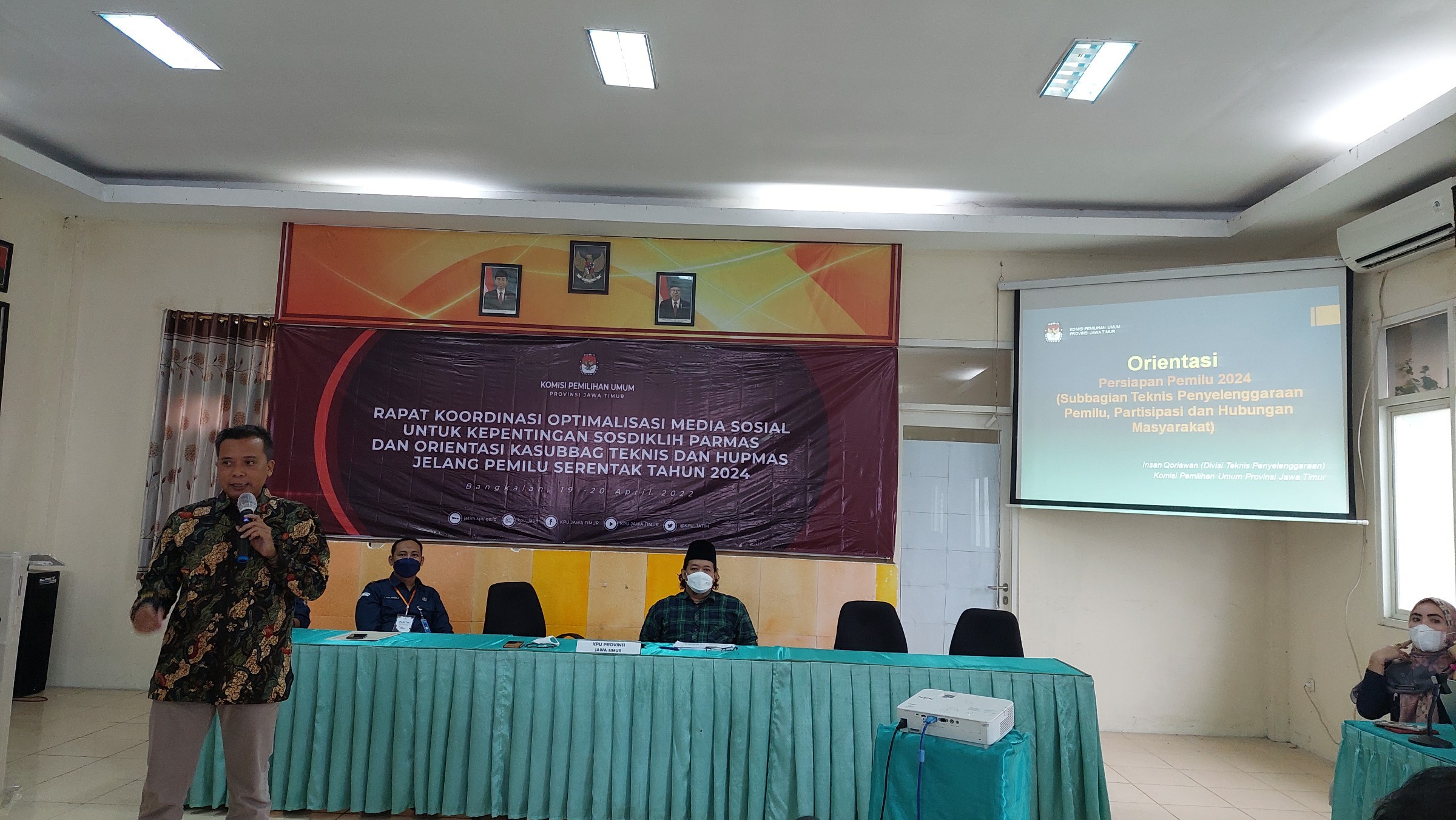 Bangkalan, kab-blitar.kpu.go.id – KPU Kabupaten Blitar mengikuti kegiatan rapat koordinasi optimalisasi media sosial untuk kepentingan sosdiklih parmas dan orientasi kasubbag teknis dan hupmas jelang pemilu serentak tahun 2024 yang digelar oleh KPU Provinsi Jawa Timur, Selasa (19/4) dan Rabu (20/4). Kegiatan tersebut dilaksanakan di KPU Kabupaten Bangkalan, Jalan RE. Marthadinata No. 1A Mlajah, Bangkalan, Jawa Timur. Kegiatan tersebut dihadiri oleh Divisi Sosdiklih Parmas dan SDM serta Kasubbag se-Jawa Timur. Adapun dari KPU Kabupaten Blitar dihadiri oleh M. Bahaudin selaku Anggota KPU Divisi Sosdiklih Parmas dan SDM serta M. Hudin Mukhlisi selaku staf mewakili Kasubbag Teknis dan Hupmas.
