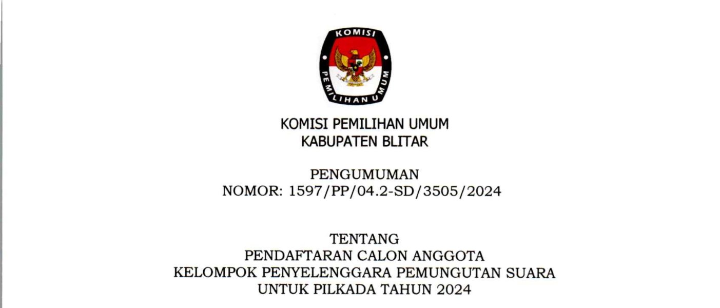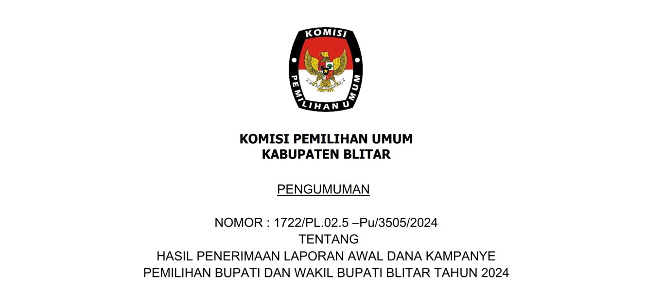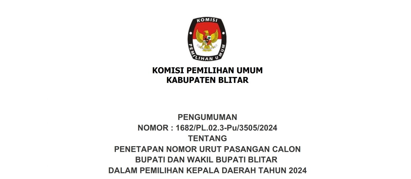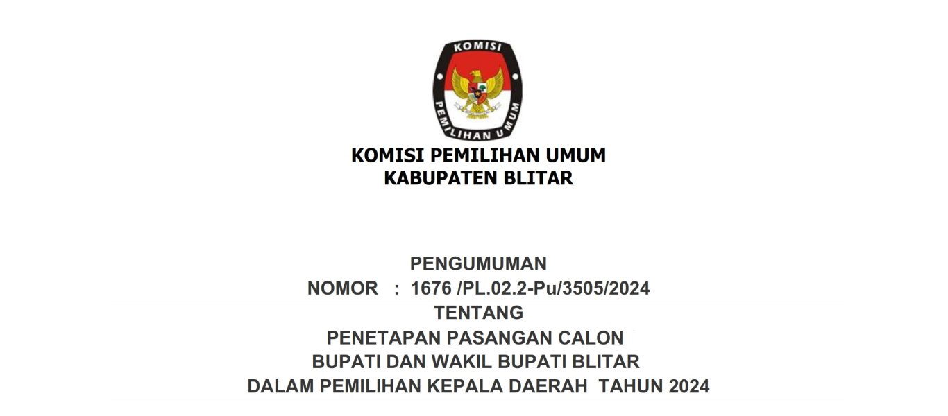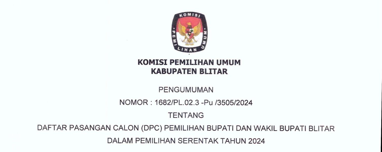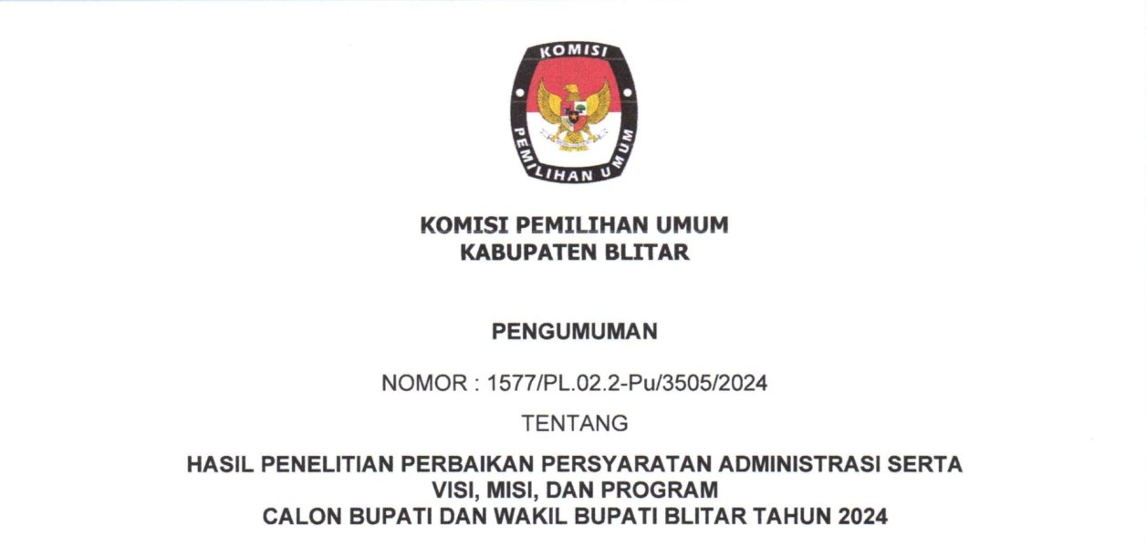 PENGUMUMAN HASIL PENELITIAN PERBAIKAN PERSYARATAN ADMINISTRASI SERTA VISI, MISI, DAN PROGRAM CALON BUPATI DAN WAKIL BUPATI BLITAR TAHUN 2024 (Klik Disini)