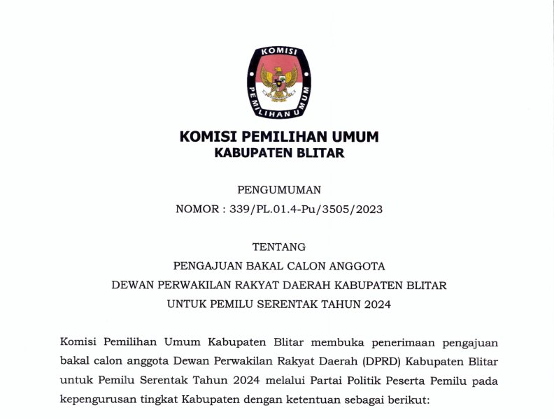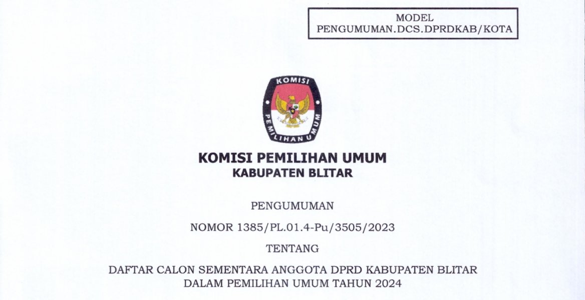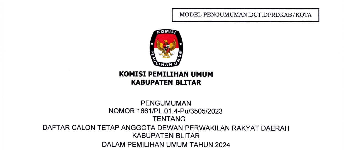 1. PENGUMUMAN DCT ANGGOTA DPRD KABUPATEN BLITAR PEMILU 2024 (Klik Disini)